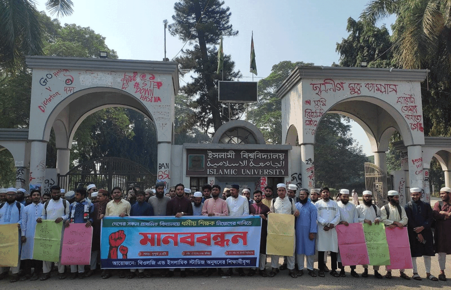 রবিবার (৯ নভেম্বর) দুপুর ১২টার দিকে বিশ্ববিদ্যালয়ের প্রধান ফটকের সামনে তারা এ কর্মসূচি পালন করেন। মানববন্ধনে শিক্ষার্থীদের হাতে দেখা যায়— ‘প্রাথমিকে ধর্মীয় শিক্ষক পদ তৈরি করতে হবে’, ‘নৈতিক প্রজন্ম গড়তে হলে ধর্মীয় শিক্ষায় বিকল্প নেই’, ‘ধর্মহীন শিক্ষা অসম্পূর্ণ শিক্ষা’, ‘ধর্মীয় শিক্ষা নৈতিকতার ভিত্তি’, ‘ধর্মীয় শিক্ষক নিয়োগ দাও’— এমন নানা স্লোগান সম্বলিত প্ল্যাকার্ড।